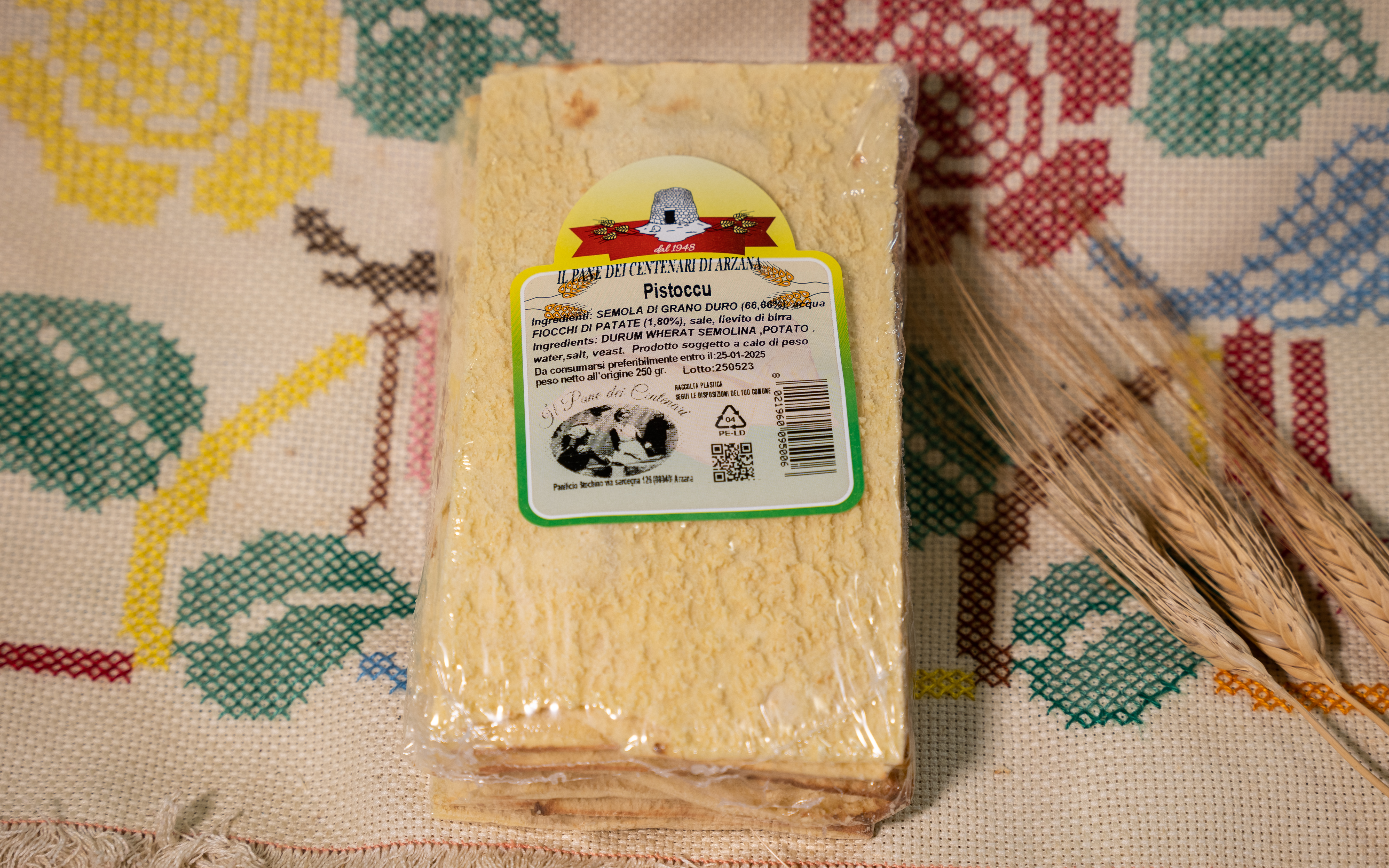 Il Pistoccu con patate è una variante del tradizionale pane sardo, arricchita con l'aggiunta di patate che conferiscono una consistenza morbida e un sapore delicato. Preparato secondo metodi artigianali, questo pane è ideale per accompagnare piatti tipici della cucina sarda, come formaggi, salumi e zuppe. La presenza delle patate rende il Pistoccu ancora più gustoso e versatile, perfetto anche da gustare da solo o con un filo d'olio extravergine. Porta in tavola il sapore autentico della Sardegna con il Pistoccu con patate, un pane che unisce tradizione e gusto in ogni morso.